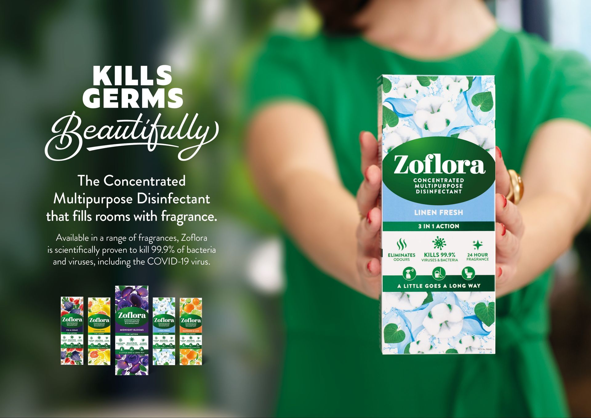 This was the character I wanted top bring to life. Zoflora brings delicate fragrance to any home. But it also kills 99% of germs. So unlike other cleaning products it doesn't just eliminate them, it 'Kills Germs Beautifully' .